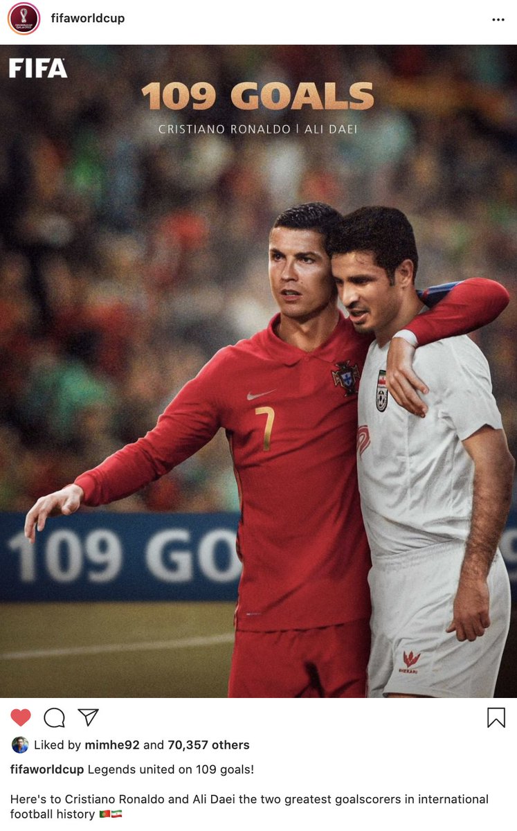 Ali Daei Vs Ronaldo : Co7kry Wjc7i3m - Ronaldo bu rekorun yanı sıra avrupa şampiyonası ve dünya kupası tarihinde toplamda 21 gol atan miroslav klose ile de aynı gol sayısına ulaştı.. 109 golle ali daei ile aynı gol sayısına ulaşan ronaldo tunuvada bir gol daha atması durumunda milli takımlar tarihinde en çok gol atan oyuncu olacak. Ronaldo bu rekorun yanı sıra avrupa şampiyonası ve dünya kupası tarihinde toplamda 21 gol atan miroslav klose ile de aynı gol sayısına ulaştı. Yet there followed a period of several months in which daei was omitted from the national side after falling out with coach mohammad mayeli kohan. He is already the top scorer in club football's top. O capitão da seleção nacional igualou ali daei na lista dos melhores marcadores de seleções com 109 golos ao serviço de portugal, motivando «parabéns cristiano ronaldo, que agora está a um golo de bater o recorde de golos pelas seleções.